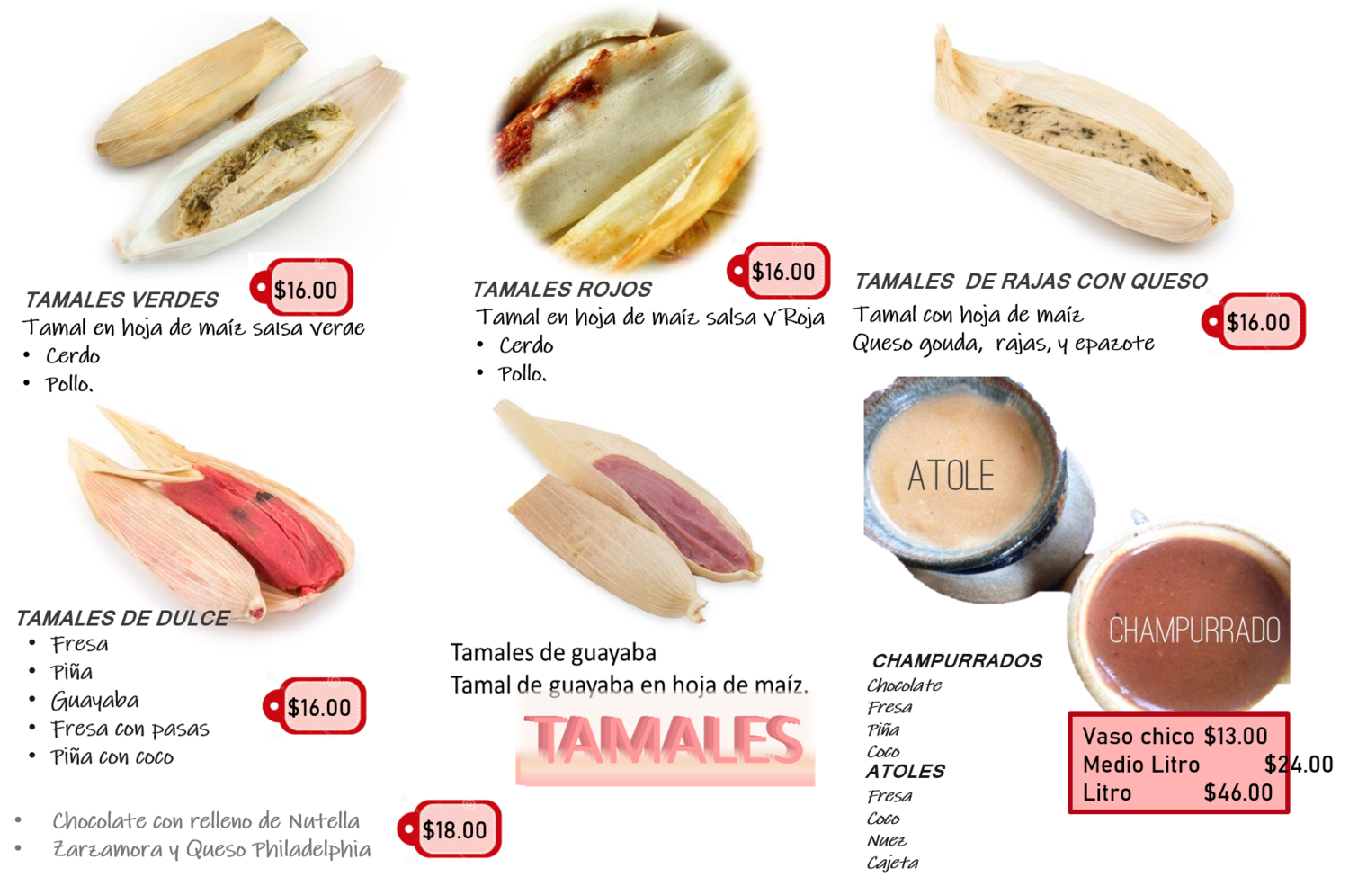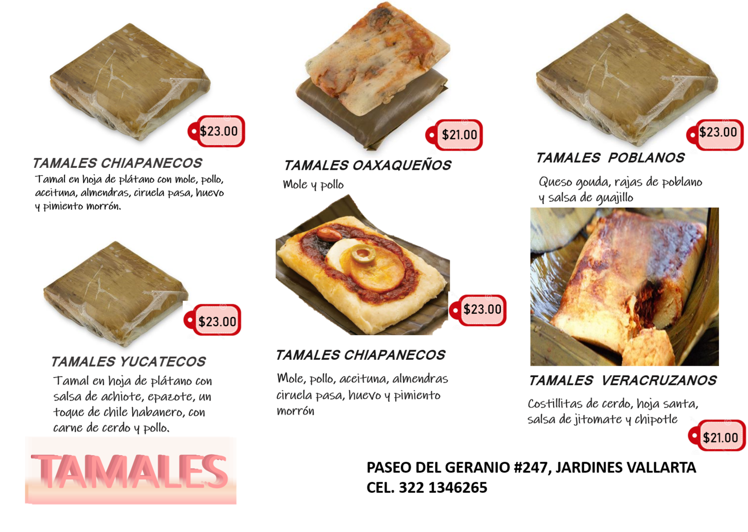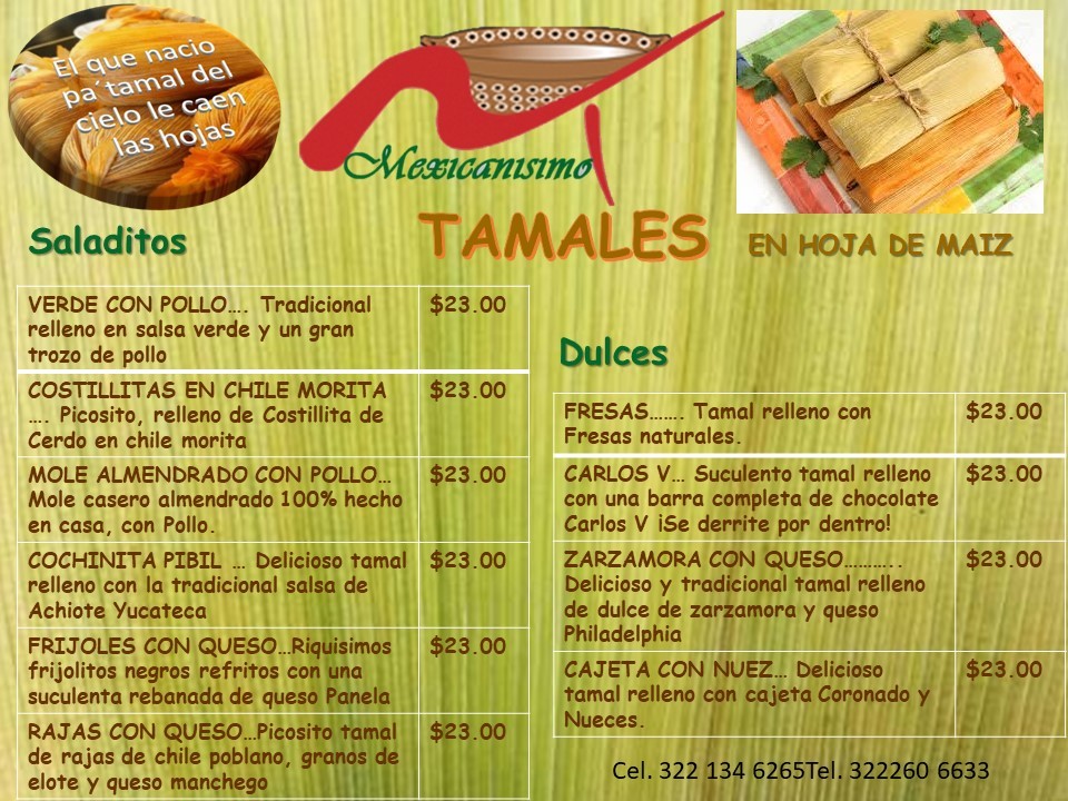 Tamales Especiales en hoja de maíz. El peso de éste tamal está entre un rango de 240gr y 280gr, dependiendo de su relleno. El costo por mayoreo (30 tamales mínimo) que manejamos es de $22.00 cada pieza.