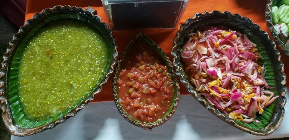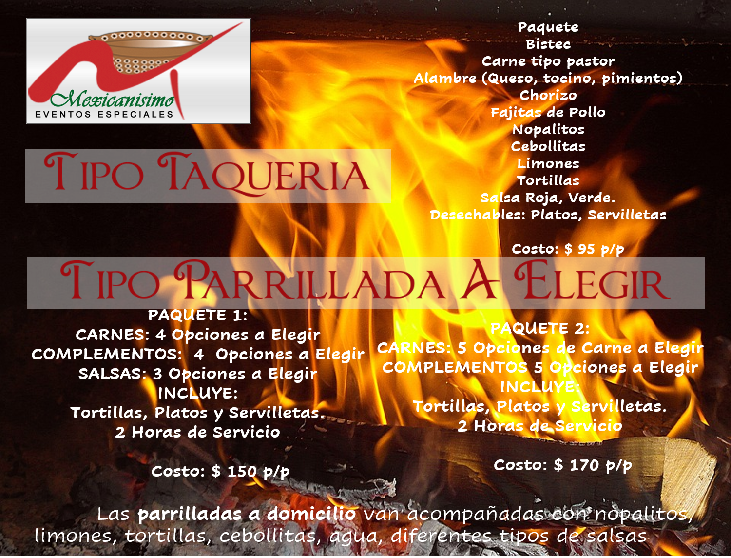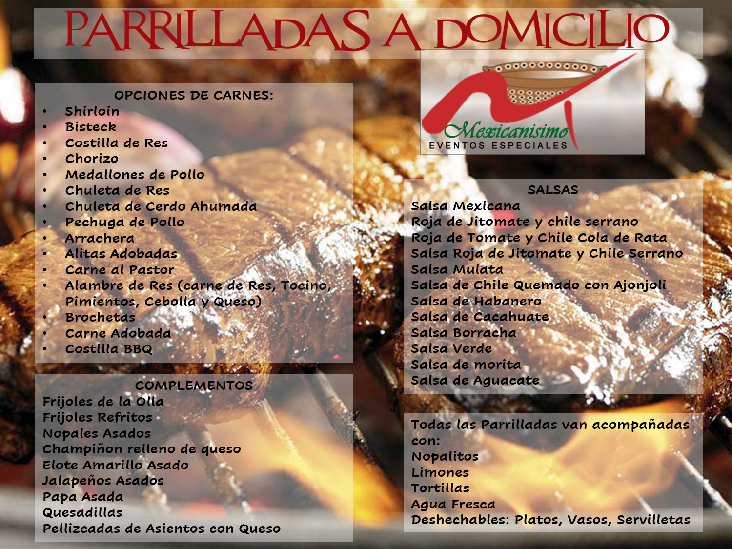 Nopalitos, Frijoles de la olla, Frijoles Refritos, Champiñones, Elotes amarillos asados, Jalapeños asados, Papas Asadas, Quesadillas, Pellizcadas con queso, Cebollitas, Limones, Tortillas hechas a Mano, Diferentes Salsas